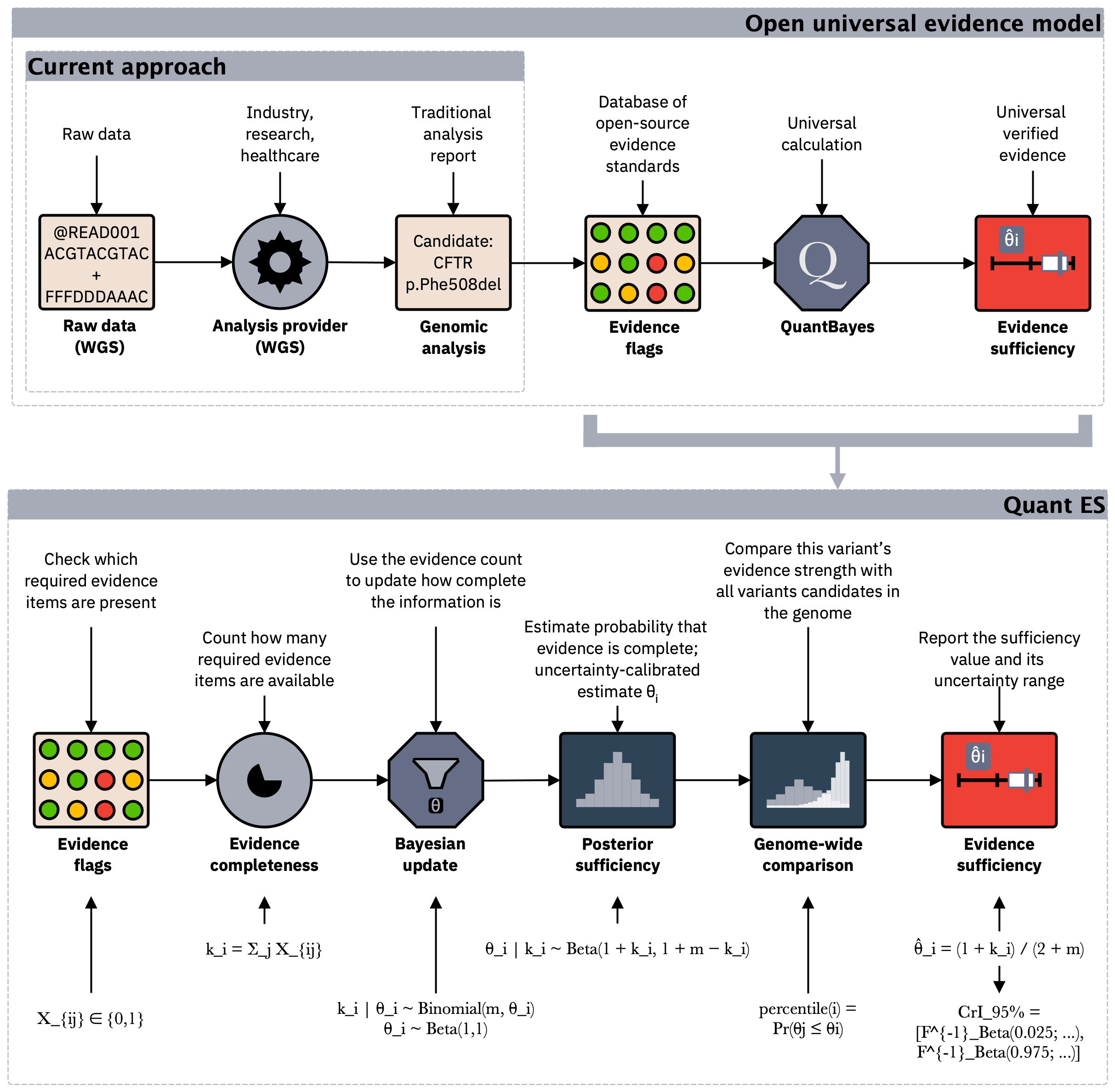 Figure 4. Under the hood, verifiable evidence is summarised using a Bayesian model to produce a single, uncertainty-calibrated metric that supports consistent interpretation and reuse across pipelines and institutions.